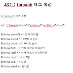 JSTL) foreach 태그 속성 ex) 1부터 5까지 for문 돌리기 ${i} 결과값 => 1, 2, 3, 4, 5 2019/02/27 - [Programming/JSTL] - JSTL) 연산자 2019/02/26 - [Programming/JSTL] - JSTL) 변수 선언 및 사용 2019/02/26 - [Programming/JSTL] - JSTL) 숫자, 날짜 format문 2019/02/26 - [Programming/JSTL] - JSTL) if, choose 조건문